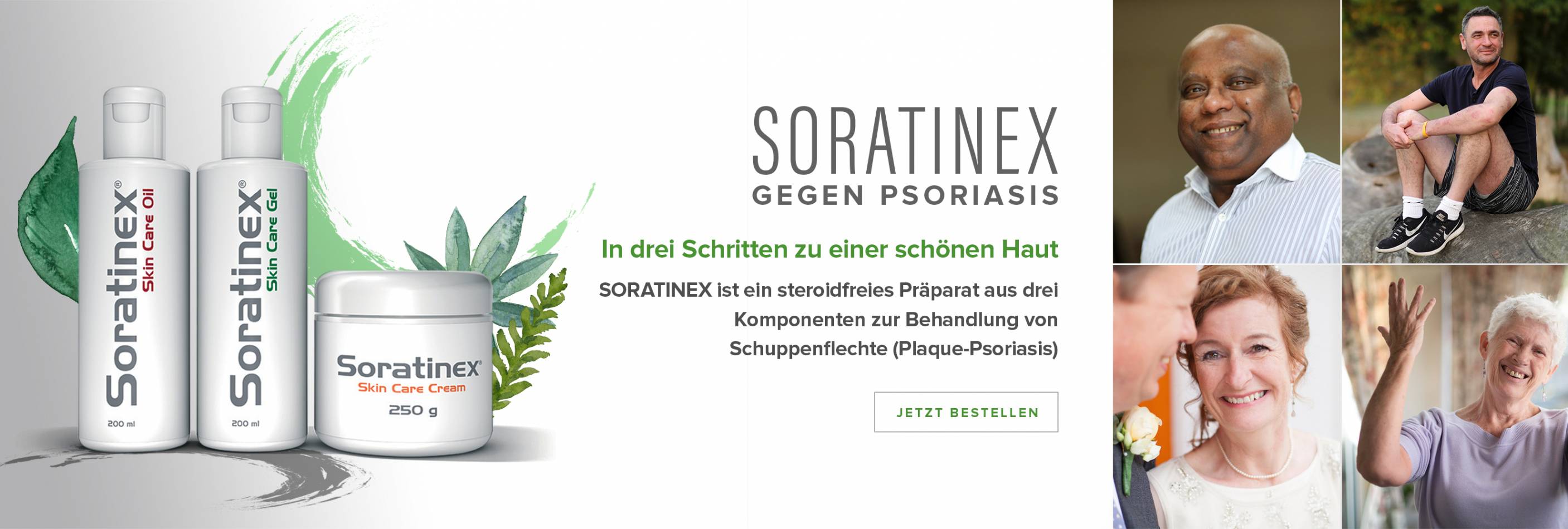 Soratinex ist eine kortisonfreie Behandlung der Plaque-Psoriasis (der häufigsten Form) in drei Stufen, welche vom australischen klinischen Biochemiker Dr. Michael Tirant PhD entwickelt wurde. Die Produkte bestehen aus vielen verschiedenen Komponenten, welche natürliche Öle, pflanzliche Inhaltsstoffe und Mineralien beinhalten. Die Behandlung umfasst: Ein Pflegegel, welches trockene Schuppen entfernt, die Haut glättet und das Eindringen der Soratinex-Hautpflegecreme erleichtert und vorbereitet; Eine Hautpflegecreme, die hilft, Entzündungen zu unterdrücken; Ein Hautpflegeöl, welches die Haut mit Feuchtigkeit versorgt und eine schützende Schicht bildet, damit die Hautpflegecreme effektiv wirken kann. Das 3 – Komponenten- Set kann zweimal täglich, sowohl am Körper als auch auf der Kopfhaut angewendet werden. Die Produkte wurden an zahlreichen europäischen Krankenhäusern und Kliniken von Dermatologen getestet. Die Testergebnisse zeigen, dass bei 85 Prozent der getesteten Patienten eine Verbesserung der Symptome zwischen 51 und 100 Prozent erreicht wurde. Soratinex (oder in anderen Ländern als Dr. Michaels vermarktet) ist nach europäischen Gesetzen zur Zulassung als Medizinprodukt vorgesehen. Weitere Informationen finden Sie hier:
